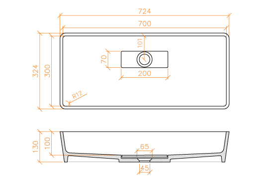 Lavabo rectangular de encimera, moldeado en Solid Surface, con 2″ agujero de drenaje central.