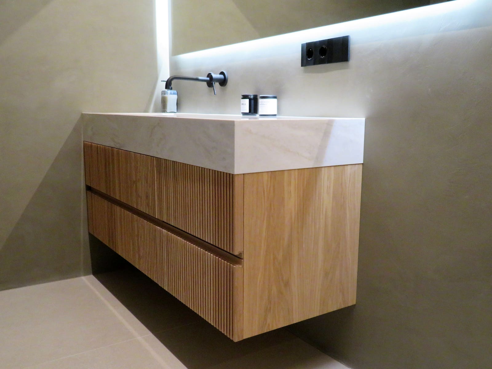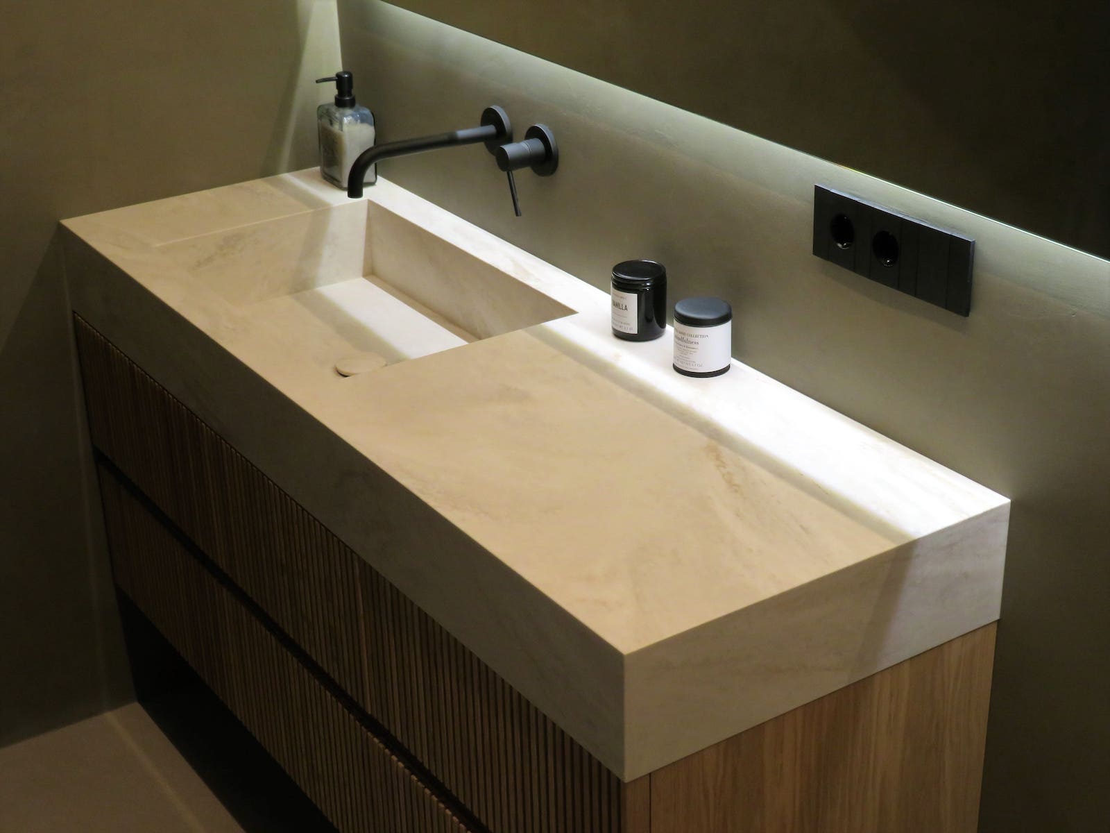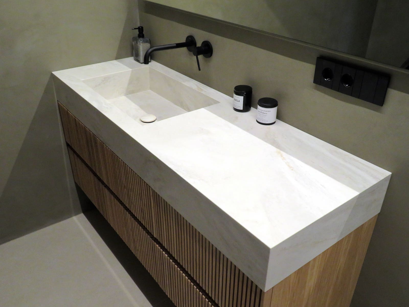 Este lavabo realizado en Corian destaca por su diseño limpio y contemporáneo, con un seno integrado que crea una superficie continua y elegante. La combinación del Corian blanco con el mueble suspendido de madera aporta calidez y equilibrio visual, mientras que las líneas rectas y los detalles cuidados refuerzan su carácter minimalista. Un conjunto funcional y sofisticado, pensado para aportar luminosidad y sensación de orden al espacio de baño.