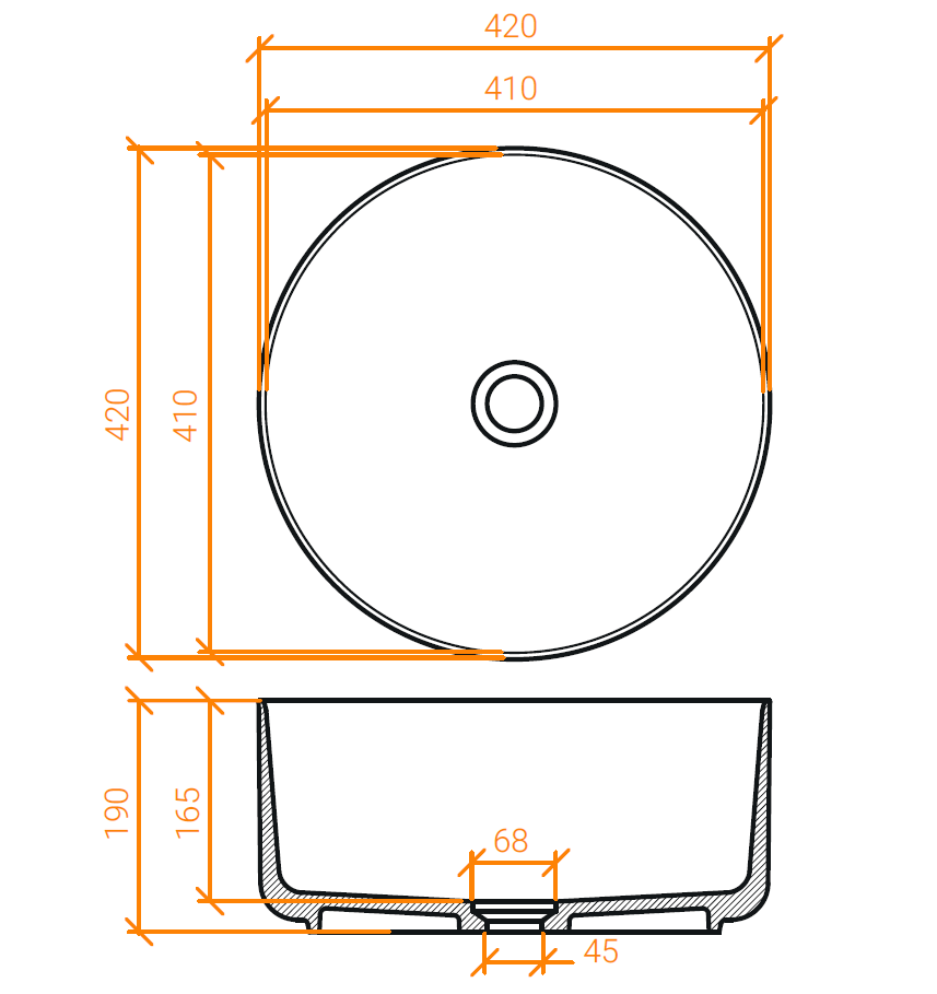 Lavabo redondo de encimera con borde fino de piedra acrílica pura Solid Surface(100% acrílico) con agujero de drenaje central bajado por 2″.