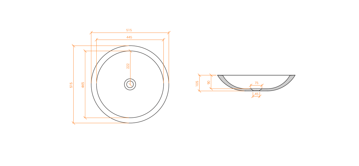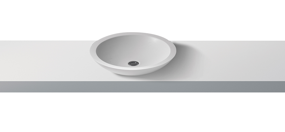 Lavabo redondo de encimera, moldeado en Solid Surface - Piedra acrílica pura (100% acrílico), con 2″ agujero de drenaje central.