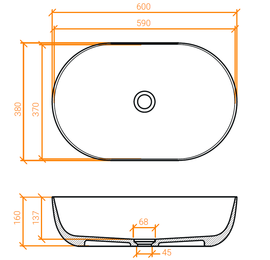 Lavabo ovalado de encimera con borde fino en Solid Surface. Piedra acrílica pura (100% acrílico) con agujero de drenaje central bajado por 2″.