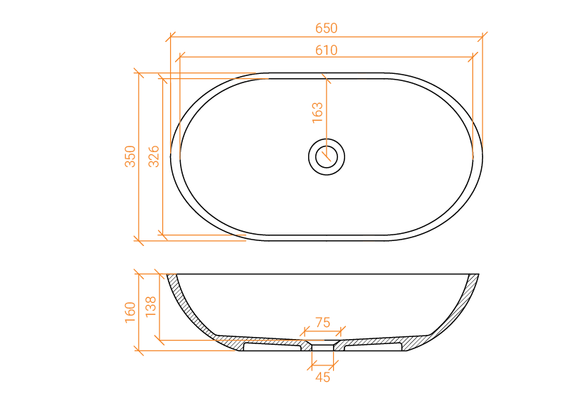 Lavabo ovalado de encimera en piedra acrílica pura Solid Surface (100% acrílico) con agujero de drenaje central de 2″.