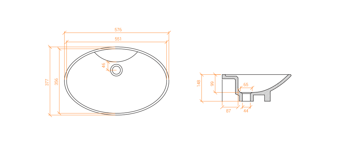 Lavabo ovalado de encimera, moldeado en Solid Surface - Piedra acrílica pura (100% acrílico), con un agujero de drenaje 2″ en el centro.