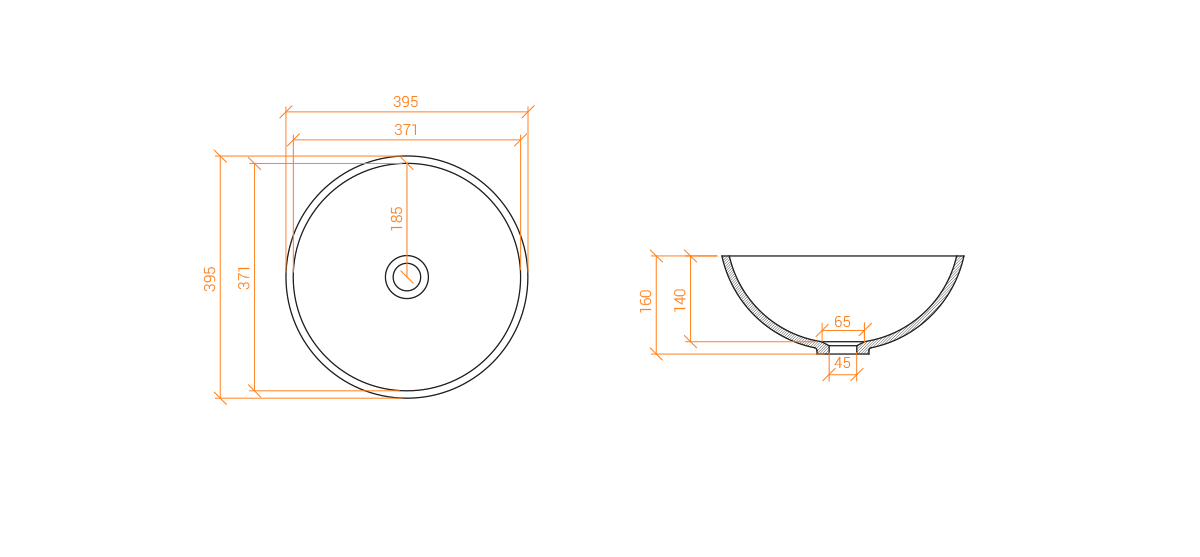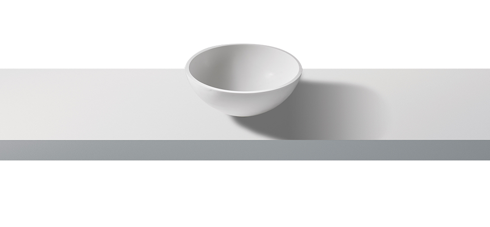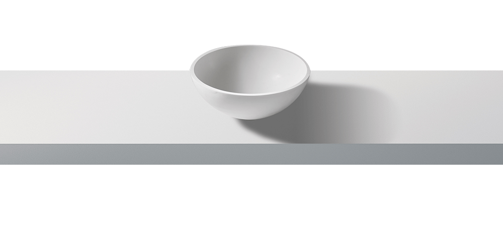 Lavabo redondo de encimera, moldeado en Solid Surface - Piedra acrílica pura (100% acrílico), con 2″ agujero de drenaje central.